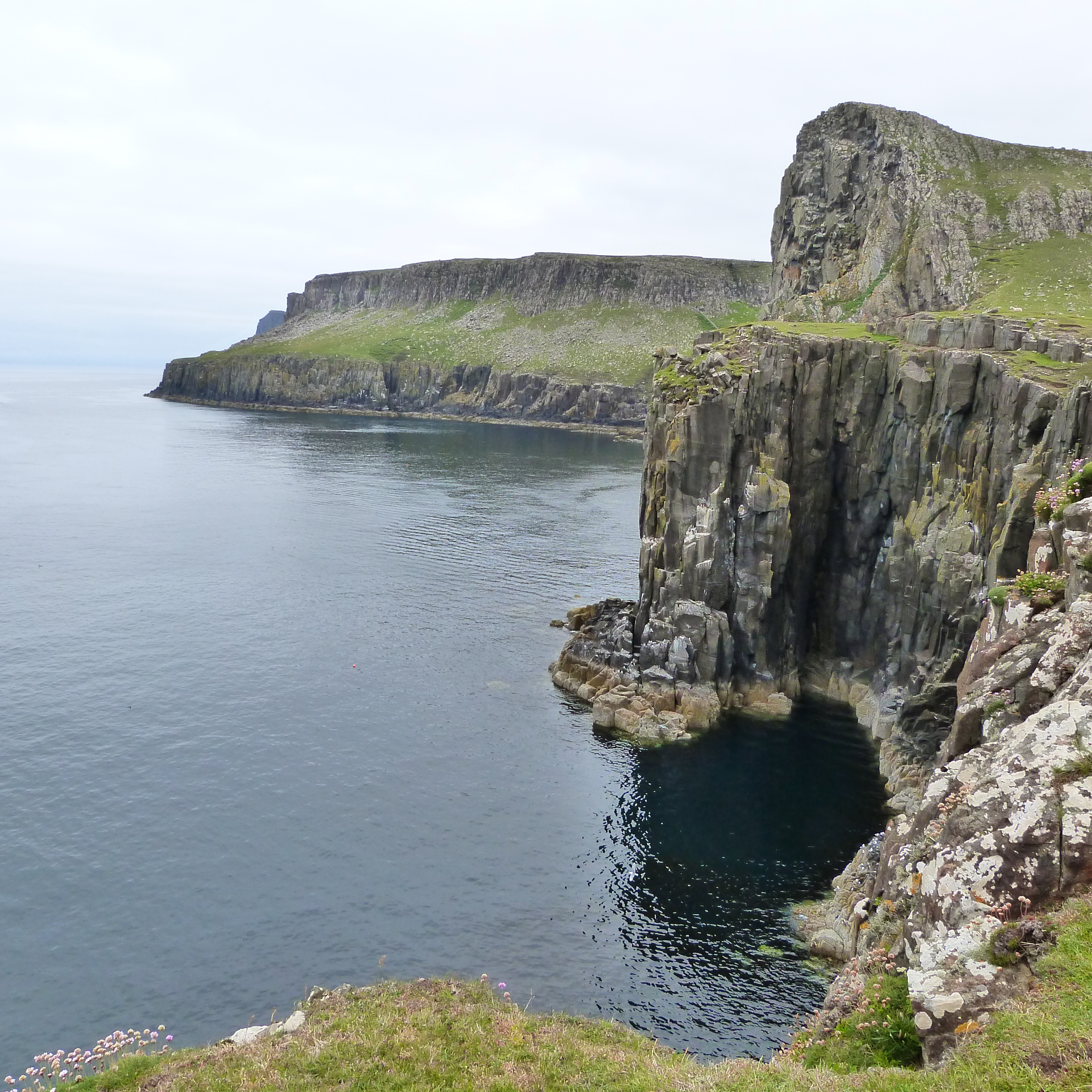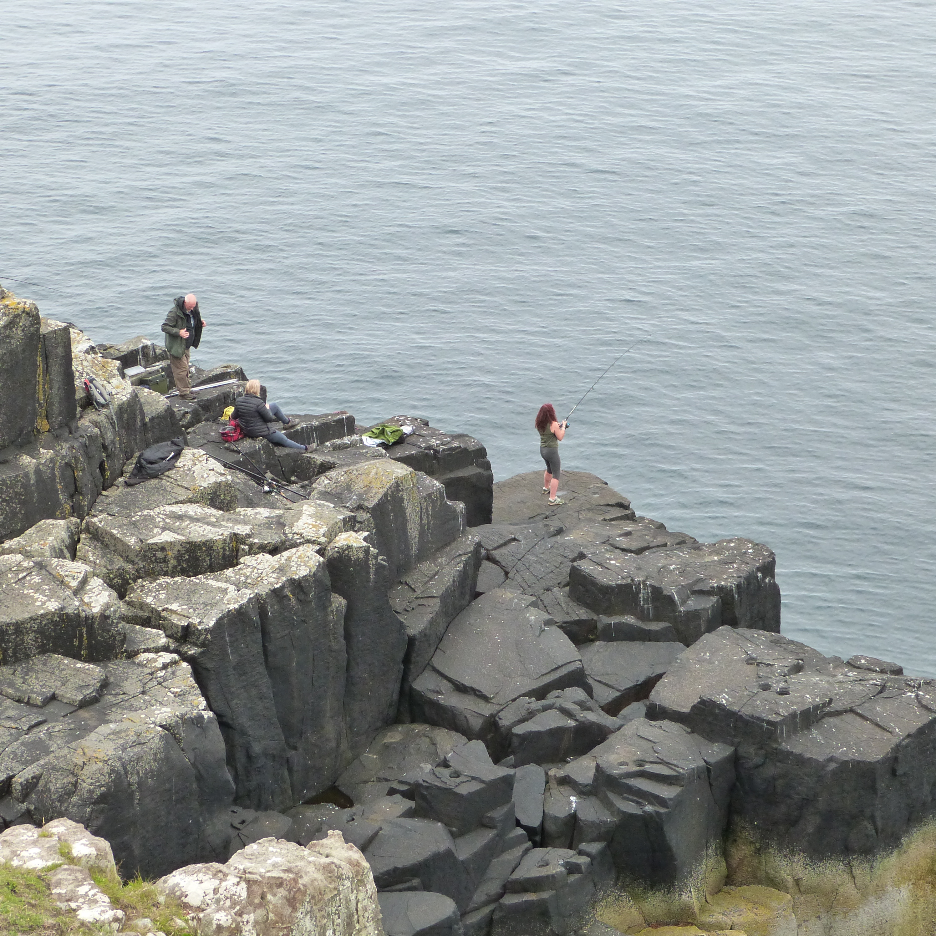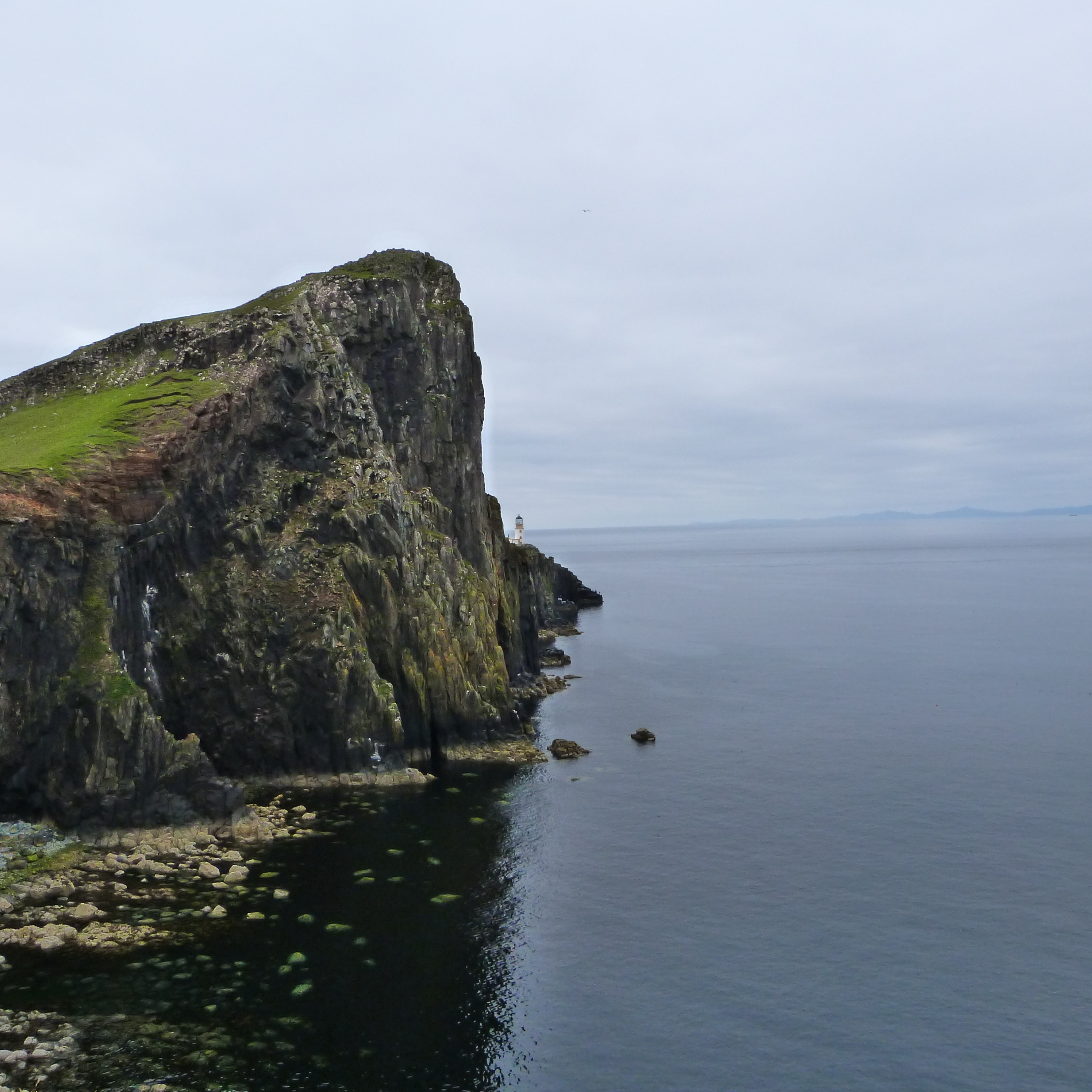 The other place was Neist Point Lighthouse where the walk down to it was the actual highlight, once more with steep cliffs. It was a beautiful calm morning, not a breath of wind and it was so quiet (very few tourists had emerged yet) we could hear birds flapping on the water below us…. magic! And as we walked back at one spot we watched some locals fishing off rocks, far below us, for mackerel. They were getting a few too.