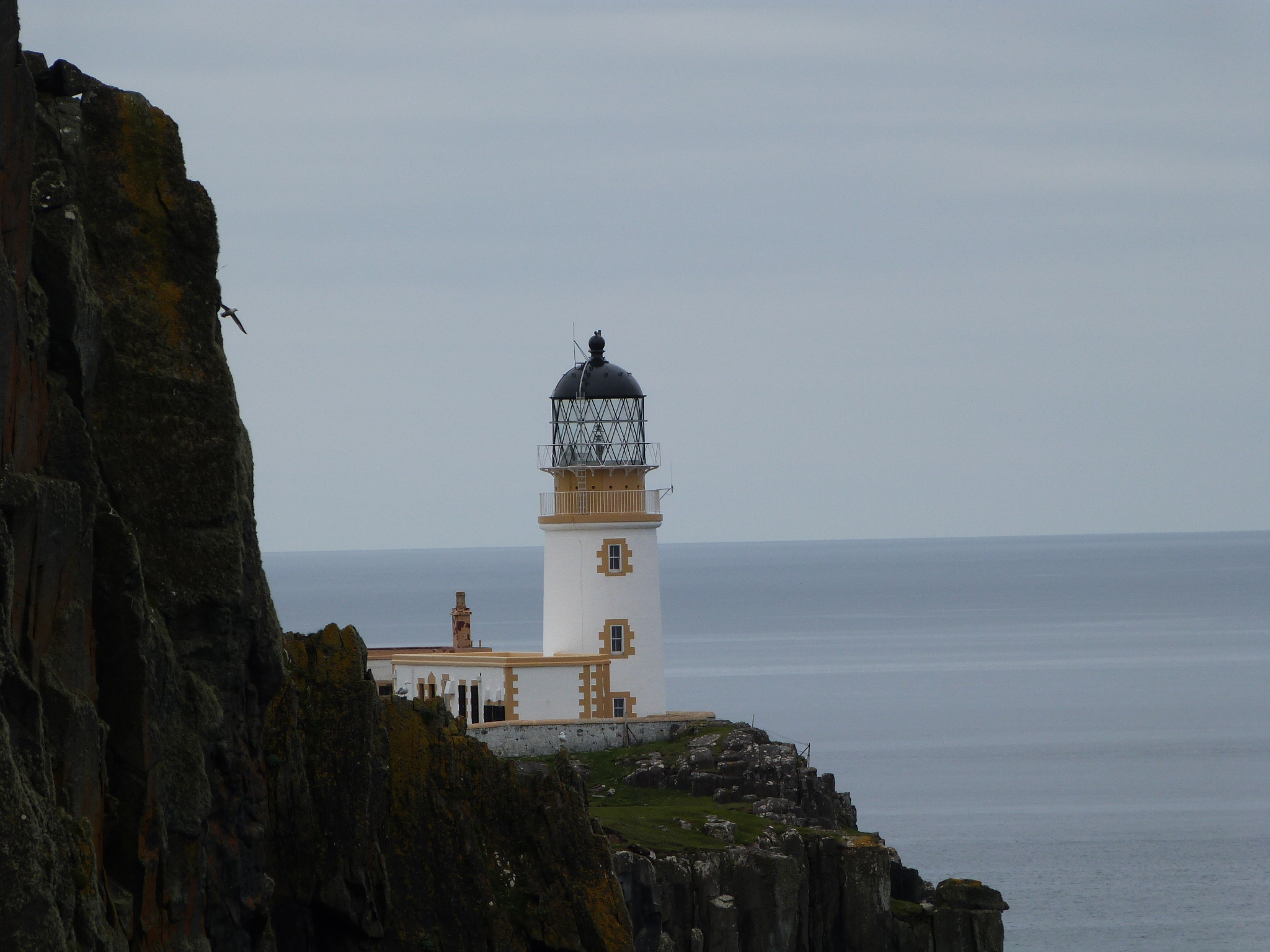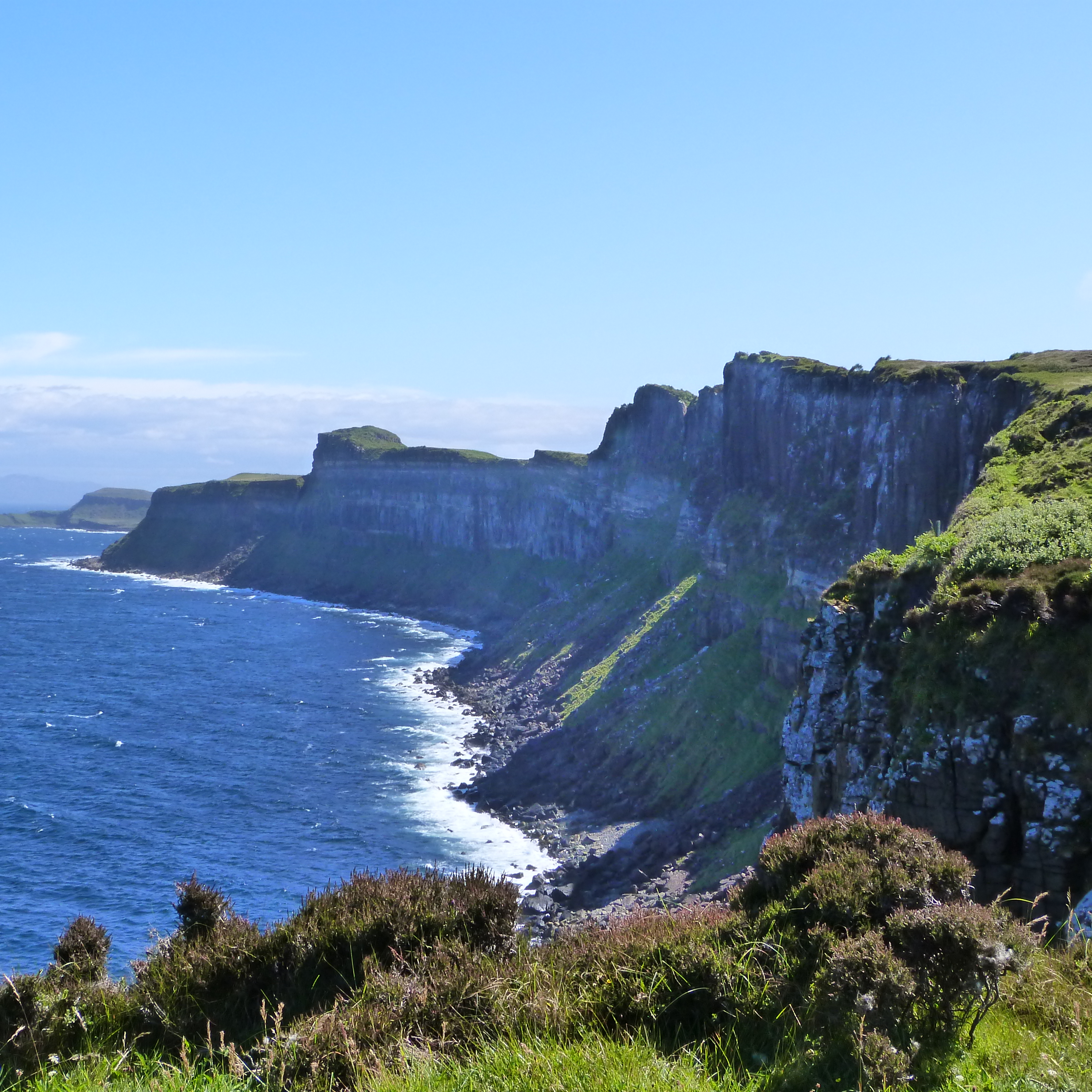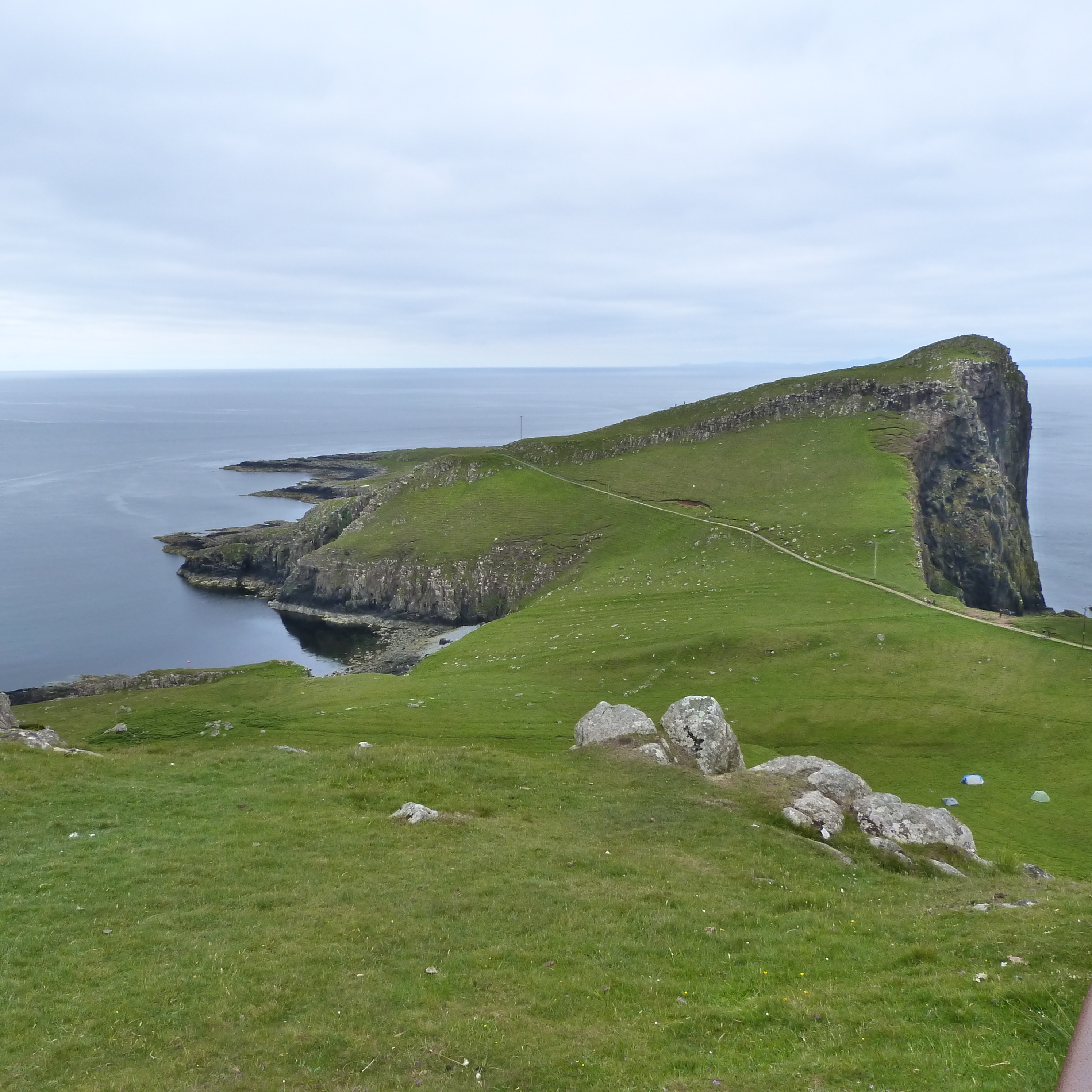 The other place was Neist Point Lighthouse where the walk down to it was the actual highlight, once more with steep cliffs. It was a beautiful calm morning, not a breath of wind and it was so quiet (very few tourists had emerged yet) we could hear birds flapping on the water below us…. magic! And as we walked back at one spot we watched some locals fishing off rocks, far below us, for mackerel. They were getting a few too.