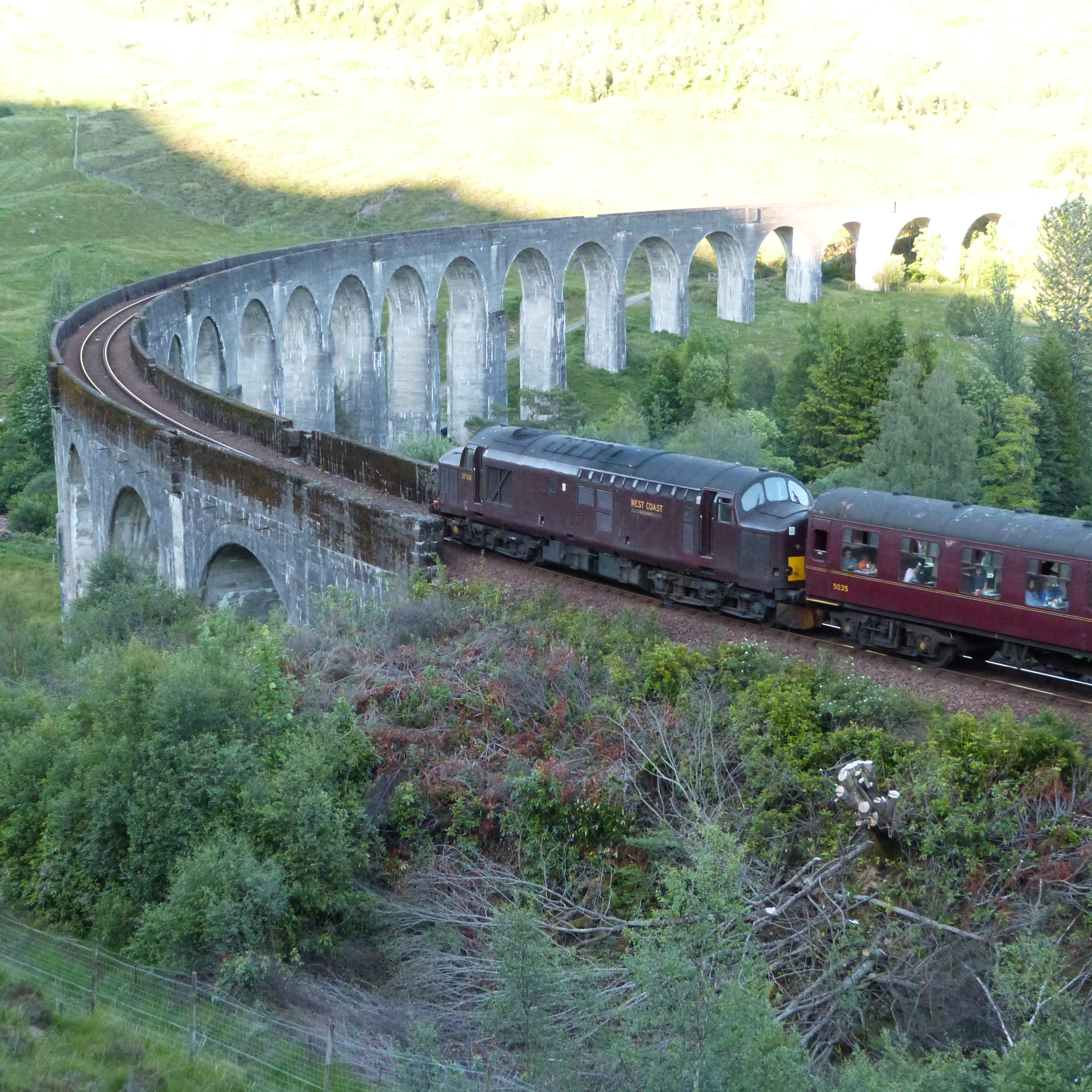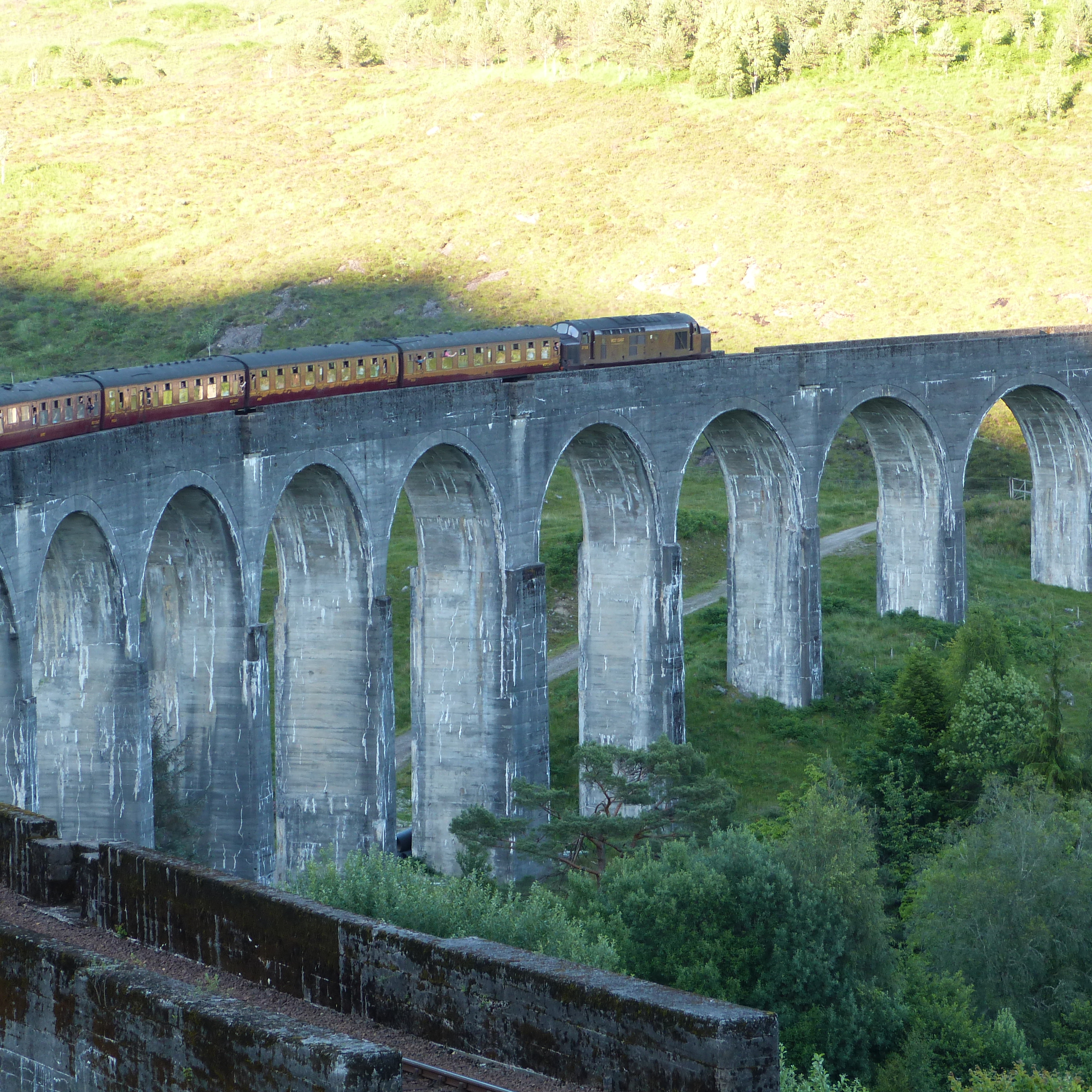 Wednesday finished on another high, of sorts. We drove from Skye to Fort William, a stopping off point along the way to Glasgow. It is a 30 minute drive from Fort William to Glenfinnan which is the location of a very famous train viaduct. It is the one used in the Harry Potter movies. We arrived about 6.30pm and the guy in the tourist shop said that a steam train was due to go over the viaduct at 7.45 so if we climbed to a viewing point we should be able to get some good photos. He was right about the view, not the train. It was a diesel, but hey, we still managed to see a train crossing the viaduct, which most people probably don’t. Still a high point!!